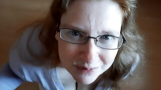 Mature brunette in glasses cherishes huge facial cum shot.