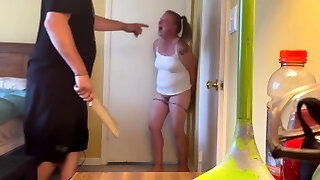 Ponytailed brunette serf milf tied up to a chair gets lashed by her husband and screams