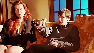Mature white man and his blonde cougar playmate on the couch