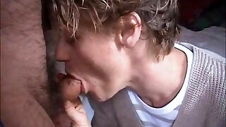 Blonde milf sucks a gigantic hairy cock and swallows cum